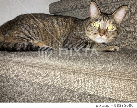 階段に伏せて、怪しく目を輝かせるキジトラの猫ちゃんです。