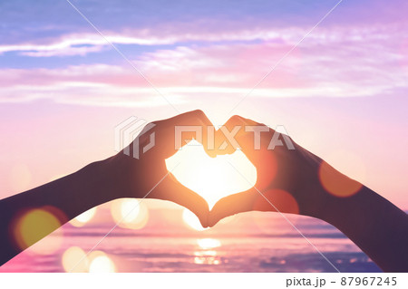 Female hands heart shape on sunset sky at tropical beach abstract background.