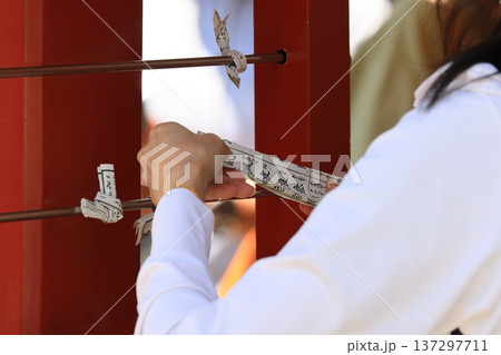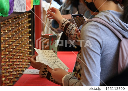 おみくじをする女性 旅行をする女性 中華街で観光する女性
