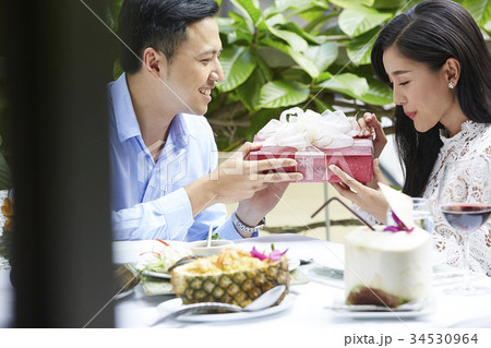 romantic boyfriend is giving a present to his girlfriend in restaurant