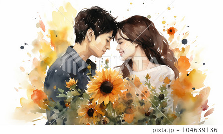 ひまわり畑の中で見つめ合う若い男女の恋人達:水彩画