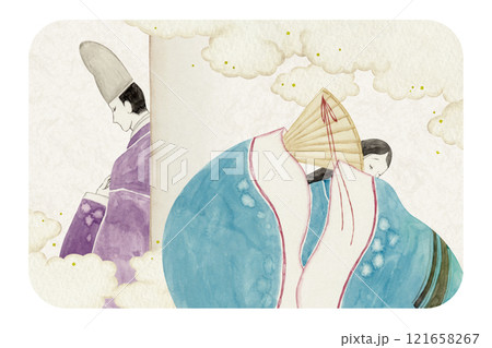平安王朝風の男女の逢瀬のイラスト。日本の民族衣装「狩衣」の男性と「袿」の女性
