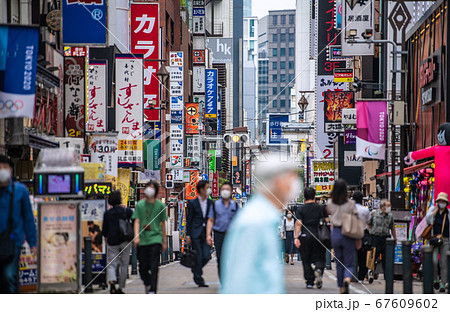 日本の東京都市景観 マスク姿が目立つ新橋の飲み屋街=7月16日