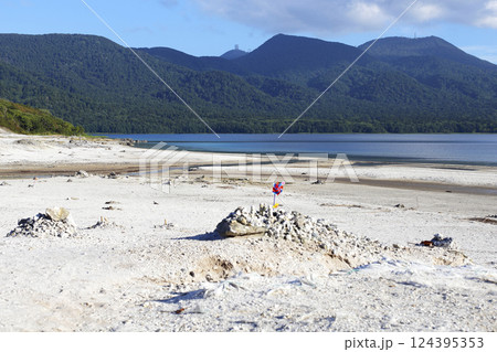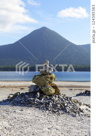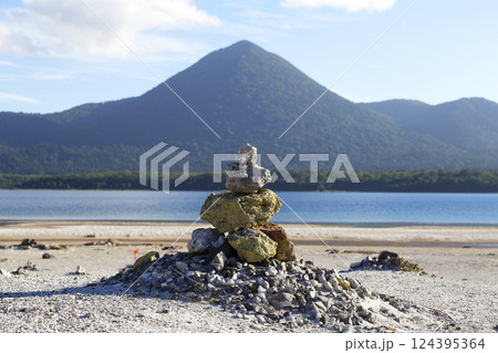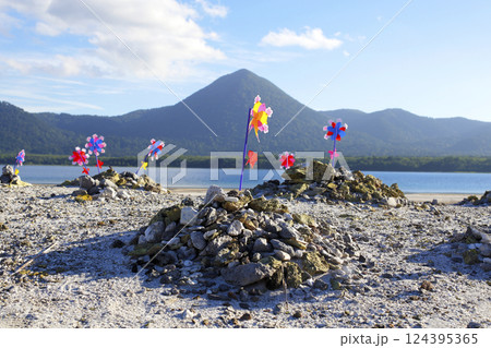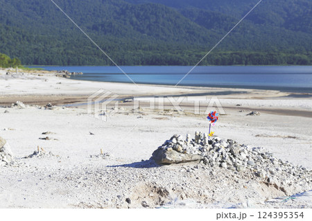 恐山 宇曽利山湖畔 極楽浜の石積みとかざぐるま