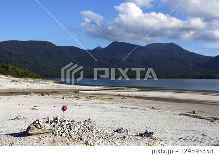 恐山 青空と大尽山 宇曽利山湖と白い砂浜(極楽浜)