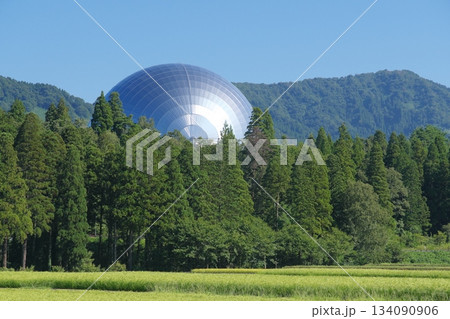 田園地帯から見る福井県立恐竜博物館の恐竜ホール