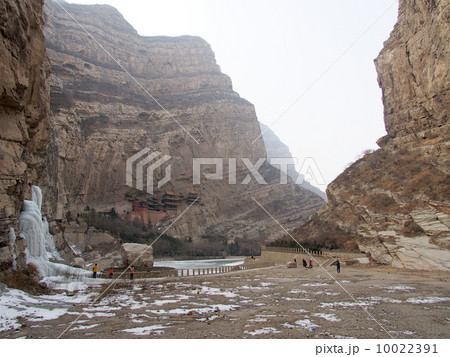 中国 恒山 懸空寺と氷結した川