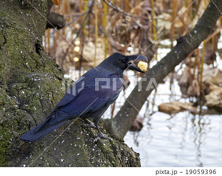 餌を咥えているカラス