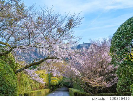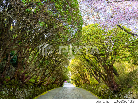 恩賜箱根公園の中央園路にあるアセビのトンネルと満開のソメイヨシノ