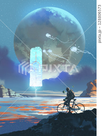 Cyclist Observing Floating Monolith and Lightning on Distant Planet