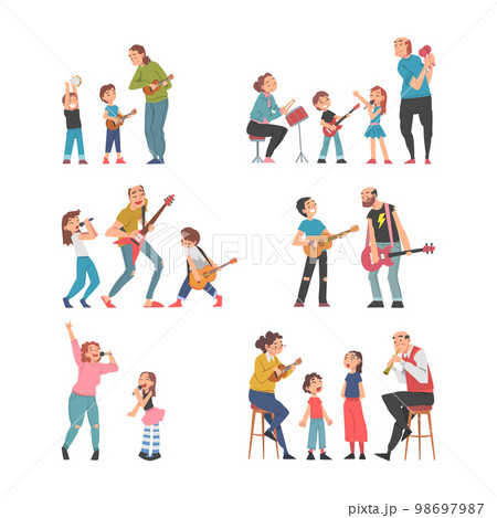 Grandpa and Grandma Singing and Playing Musical Instrument with Grandchild Vector Illustration Set