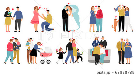 Family life stages from dating to having children. Engagement and wedding ceremony. Marriage couple. Pregnancy and childbirth. Parents with happy kids. Relationship process. Vector concept