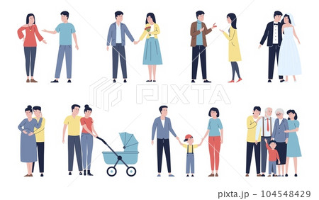 Family characters. Relationship development. Couple dating. Wedding ceremony. Young parents together with children. Pregnant mom and happy kids. Mother and father romance. Vector concept