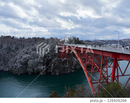 冬の日本の中部の観光名所恵那峡の橋の風景