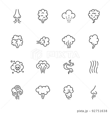 Smell icons, smoke steam and nose smelling odor scent, vapour or vapor, vector line symbols. Bad smell or stinky odour and toxic fume cloud icons with skull, smelly stink gas or smoke steam