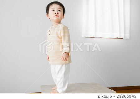 テーブルの上に乗る赤ちゃん