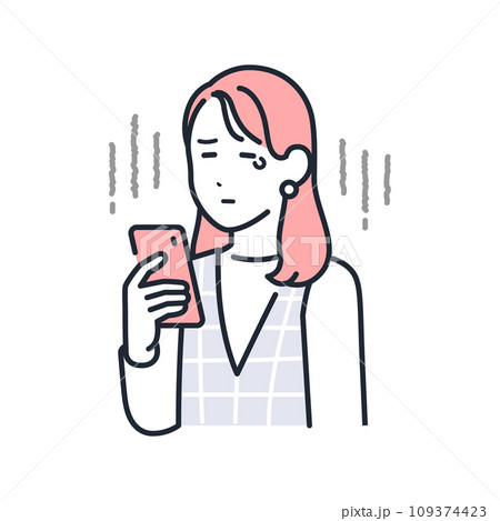 スマートフォンを見て泣くおしゃれな若い女性のシンプルなベクターイラスト素材