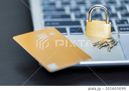 ナンバーレス クレジットカード と ノートパソコン と 鍵 【 セキュリティ の イメージ 】