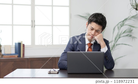 パソコンの前で悩むビジネスマンのシンプルイラスト