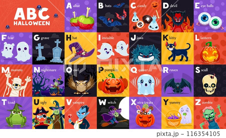 Halloween ABC, kids type or holiday alphabet for study with boo characters, vector table. Alphabet learn education letters with funny Halloween ghosts, witch and vampire, zombie and cat or spiderweb