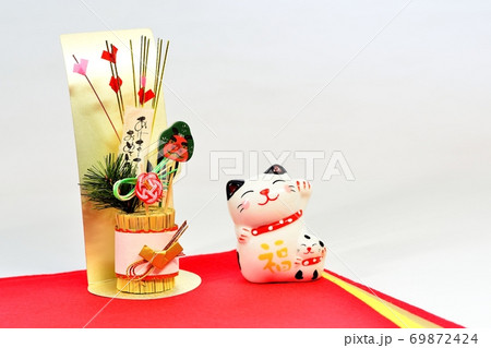 正月飾り、招き猫に門松、新年をより良い年に願う。【横】
