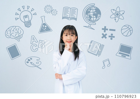 白衣を着た女の子と様々な教科のイメージ