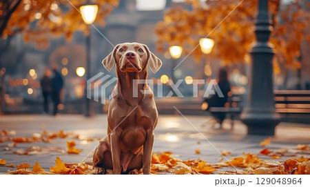 街灯に照らされ紅葉の街を見守る穏やかな犬