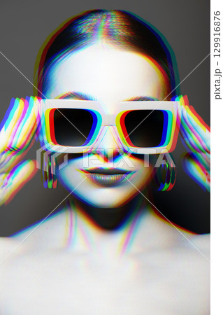 Woman portrait with classic hairstyle, big retro sunglasses and earrings in RGB color split effect style