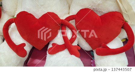 Two red plush hearts with handles. Concept of March 8, Valentine's Day, Mother's Day, and Family Day