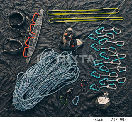 Rock or mountain climbing equipment or tools against dark background with a carabiner hook, rope for safety and security. Extreme sport object organized on floor or ground with sportswear and shoes