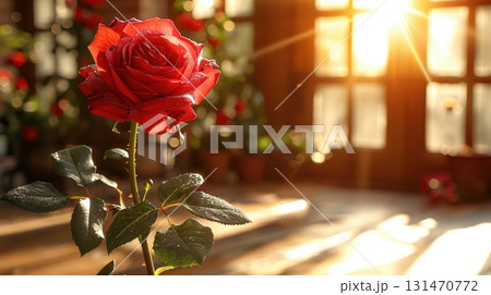 Red rose with water drops growing in a greenhouse with sunlight shining through window