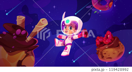 Candy planet landscape. Sweet space wonderland game background, pastry sweets magic confectionery world with lollipop tree, chocolate candies mushroom, neoteric vector illustration