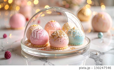ガラスドームに入った、宇宙を思わせる球体のスイーツ