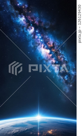 Milky Way galaxy and Earth horizon with sunrise from space. Cosmic landscape with stars and nebulae. Astronomy and universe concept