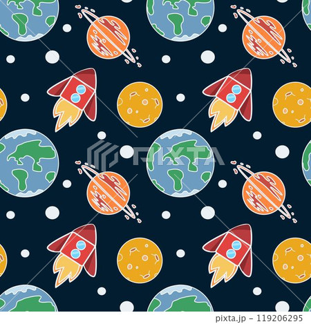Seamless childish space galaxy pattern with spaceships and planet earth, moon, rocket, stars on blue background. Fantasy planets seamless pattern for children's textiles, wrapping paper, fabric