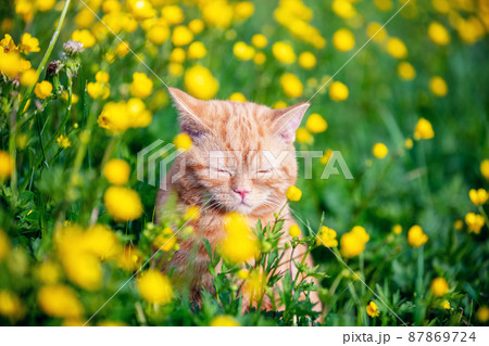Ginger kitten walking in the grass with dandelions on a summer sunny day