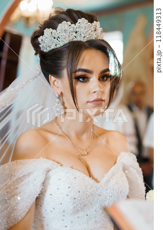 Elegant Bride in Sparkling White Gown with Ornate Tiara and Veil