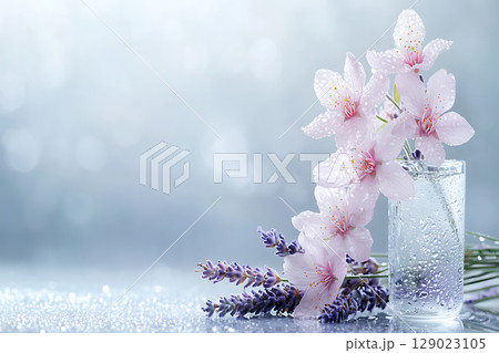 Soft Lavender and Cherry Blossom Arrangement in Glass with Dew Drops on a Gentle Background