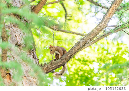 樹上で暮らすエゾンリス 飛ぶ 夏毛