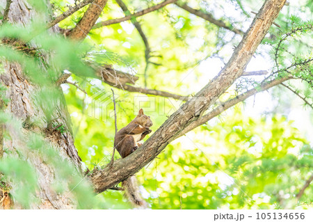 樹上で暮らすエゾンリス 喜ぶ 夏毛