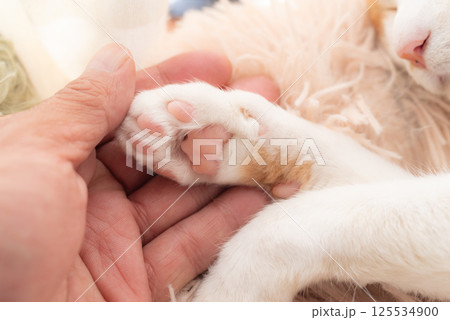 可愛い猫の手を触る人