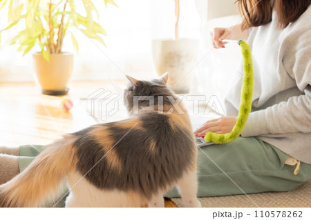 パソコンを見ている飼い主さんの側で遊ぶ猫
