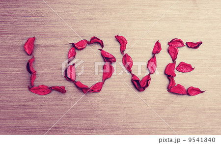 Background Valentine's Day. word love petals of red roses on a w