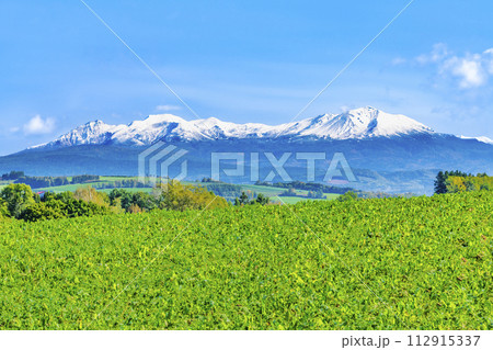 北海道 初秋の美瑛の丘と冠雪の大雪山