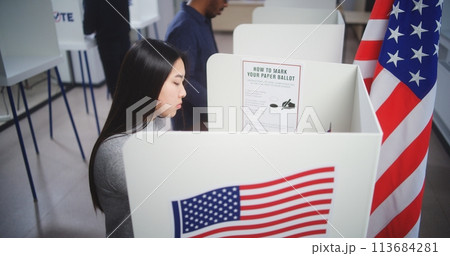 Asian woman comes to voting booth and fills out paper bulletin
