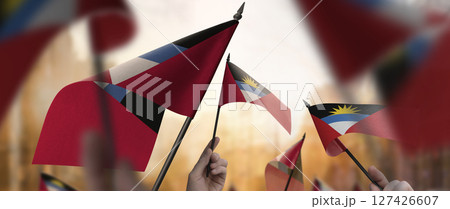 Antigua and Barbuda flags in their hands on a blurred urban background