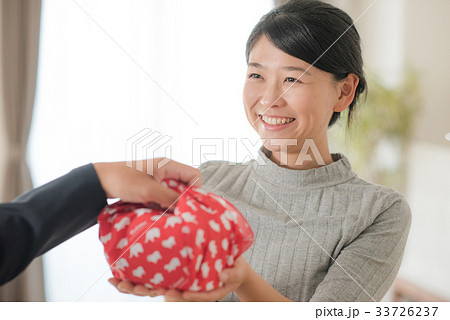 紙袋を渡す40代女性