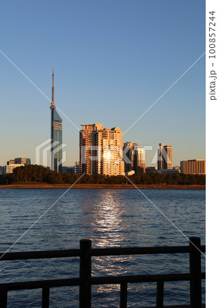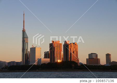 愛宕浜地区、福岡市海浜公園から見た夕暮れ時の室見川河口と福岡タワー周辺