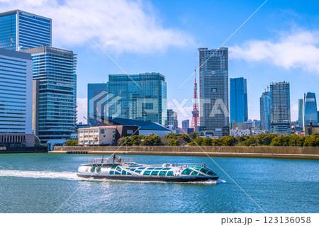 日本の東京都市景観 新風景。水上バス「エメラルダス」や竹芝、浜松町などを望む。奥に東京タワーや麻布台