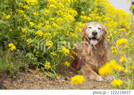 菜の花畑に佇む笑顔のゴールデンレトリバー